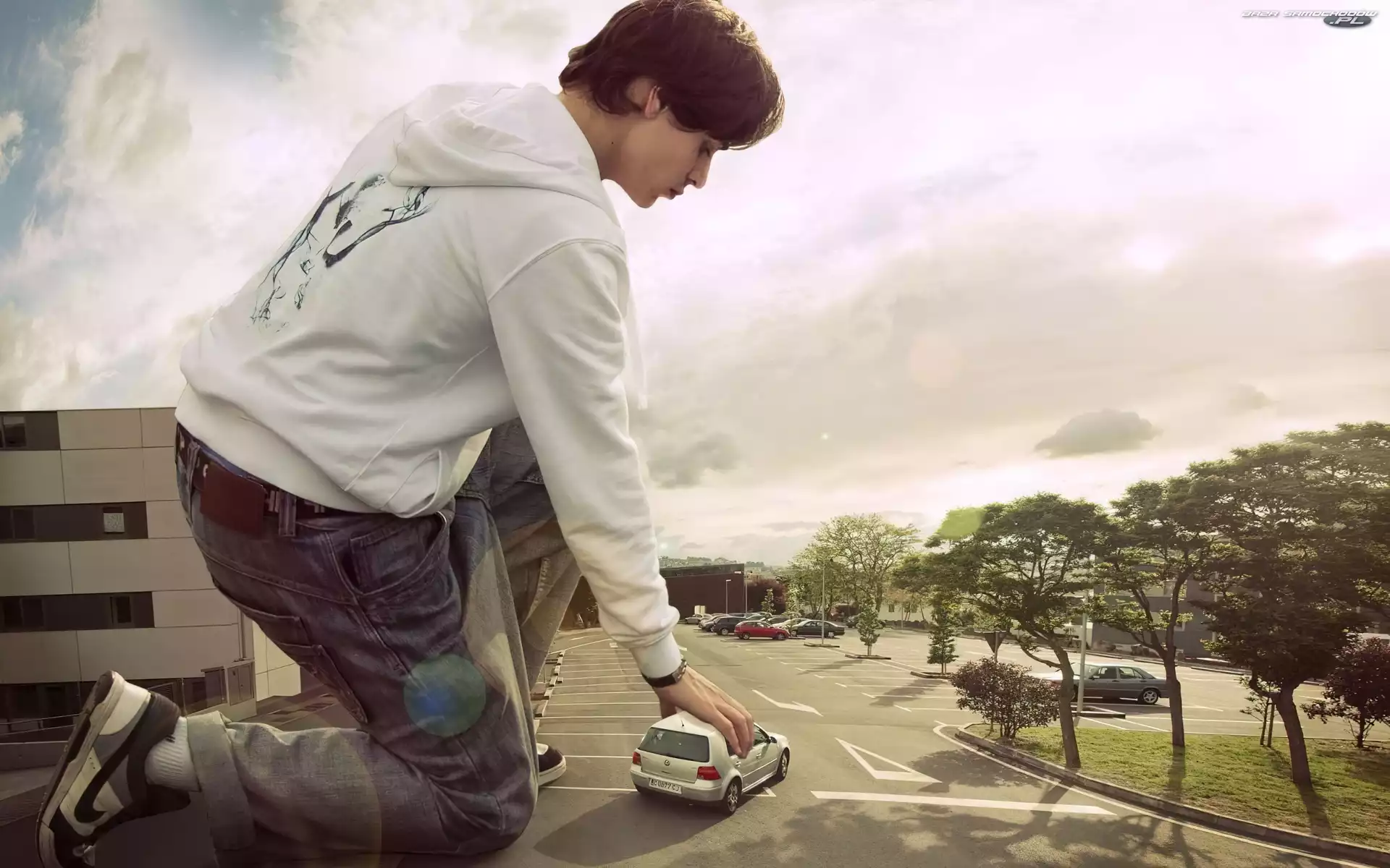 Auto, Mężczyzna, Ulica, Dom, Gigant, Drzewa- Zdjęcia samochodów